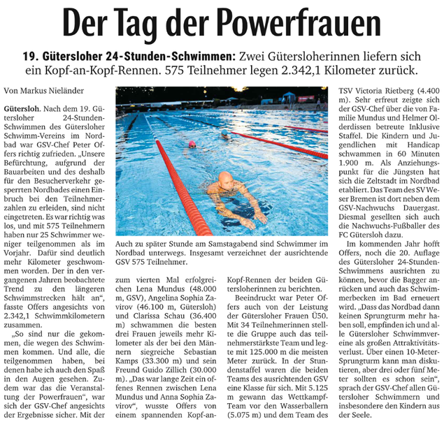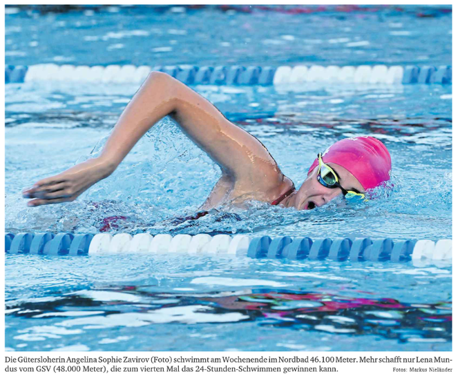 Gütersloh (kra). Die Teilnahme am Schwimmfest des VfL Kemminghausen hatte für Ines Plau-schinn in zweifacher Hinsicht einen hohen Stellenwert. „Zum einen war es der letzte Test vor den Bezirksmeisterschaften, die Anfang Dezember in Lübbecke ausgetragen werden“, erklärte die Trai-nerin des Gütersloher SV. „Zum anderen war ich gespannt, wie das Trainingslager in Duisburg